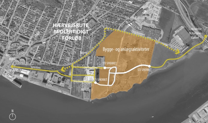 Af sikkerhedshensyn er den øst-vestgående stiforbindelse gennem Stigsborg derfor midlertidigt lukket, og hærvejsruten er omlagt til Engvej og Stigsborgvej. På kortet ovenfor kan du se, hvor det aktuelt er muligt at færdes i området. Vi åbner stien gennem Stigsborg igen så snart det er forsvarligt.